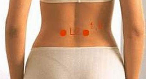 Huyệt Thận Du: lấy đối xứng từ rốn ra sau lưng một vị trí, trên cột sống đó là huyệt mệnh môn, sau đó kéo ra hai bên mỗi bên khoảng 1,5 thốn (Ảnh: Internet)