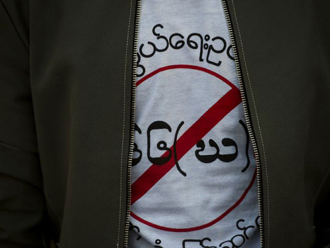 Một nhà hoạt đông mang chiếc áo thun có in thông điệp phản đối luật chống phỉ báng tại một cuộc tuần hành ở thành phố Yangon, Myanmar vào tháng 1.2017