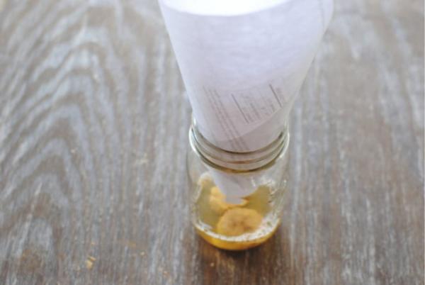 Bạn nên đặt bẫy vào buổi tối khi mọi người đã rời nhà bếp. Bỏ một vài thìa mứt, một chút giấm táo vào lọ thuỷ tinh, cuộn tờ giấy A4 thành hình phễu. Kết quả sáng hôm sau bạn nhận được sẽ là rất nhiều côn trùng bị chết phía dưới lọ.