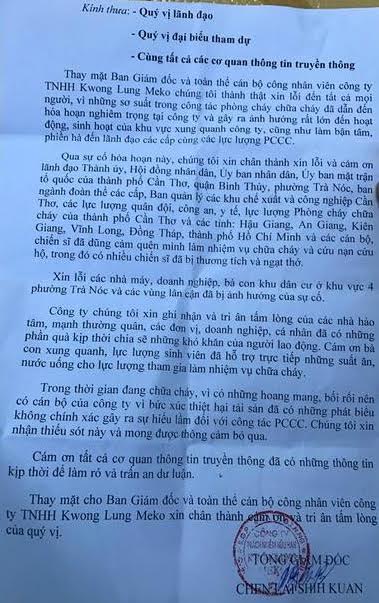 “Qua sự cố hoả hoạn này, chúng tôi xin chân thành xin lỗi và cảm ơn lãnh đạo Thành uỷ, Hội đồng nhân dân, UBND, Uỷ ban Mặt trận TP.Cần Thơ, quận Bình Thuỷ, phường Trà Nóc, ban, ngành đoàn thể các cấp, Ban quản lý các khu chế xuất và công nghiệp, lực lượng quân đội, công an, y tế, lực lượng phòng cháy chữa cháy của TP.Cần Thơ, TP.HCM và các tỉnh như Hậu Giang, An Giang, Kiên Giang, Vĩnh Long, Đồng Tháp đã dũng cảm quên mình làm nhiệm vụ, trong đó có nhiều chiến sĩ đã bị thương” - văn bản thể hiện.