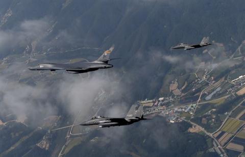 Máy bay B-1 Lancer được hộ tống bởi 2 chiếc F-15.