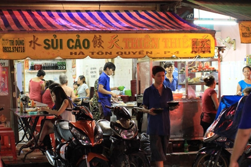 Từ đầu buổi chiều, các quán ăn đã tấp nập thực khách đến để thưởng thức những bát sủi cảo nóng hổi, hấp dẫn. Các quán ăn thường bắt đầu bán vào lúc 13h30 đến khoảng 24h. Ở đây có hơn chục quán, nhưng người sành ăn thường chọn Thiên Thiên và Như Ý là hai quán ăn ngon và lâu đời. Giá một phần từ 35.000 đồng. Điểm trừ là khách đến đây không có nhiều chỗ để xe, lúc đông khách phải gửi ở chung cư khá xa quán ăn. Ảnh: HuPa.