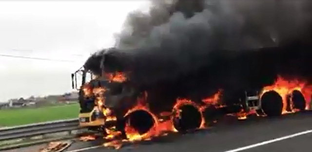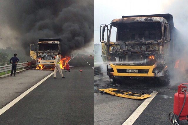 Vụ việc xảy ra trên cao tốc Hà Nội - Hải Phòng, một chiếc xe tải bốc cháy. Lái xe đã nhanh trí đạp cửa và cho xe tấp vào lề thoát thân. Chiếc xe cháy dữ dội nên không kịp dập lửa.