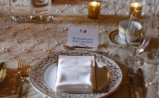 Jared Kushner đã bay từ Iraq về Mỹ để cùng vợ Ivanka tham dự tiệc tối. Hoa tươi được dùng để trang trí có màu đỏ và vàng, màu quốc kỳ của Trung Quốc. Các rèm cửa được kéo lại để làm nổi bật ánh sáng từ đèn chùm, nến và các vật dụng mạ vàng và bạc trong bữa tiệc. Ảnh: AP.