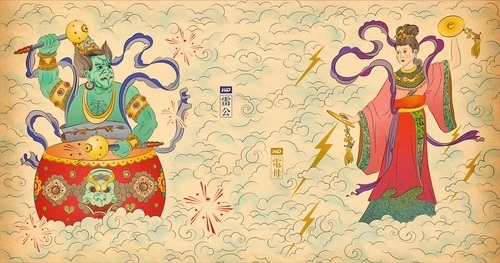 Trên ảnh là chân dung của đôi vợ chồng thần Lôi Công và Điện Mẫu.