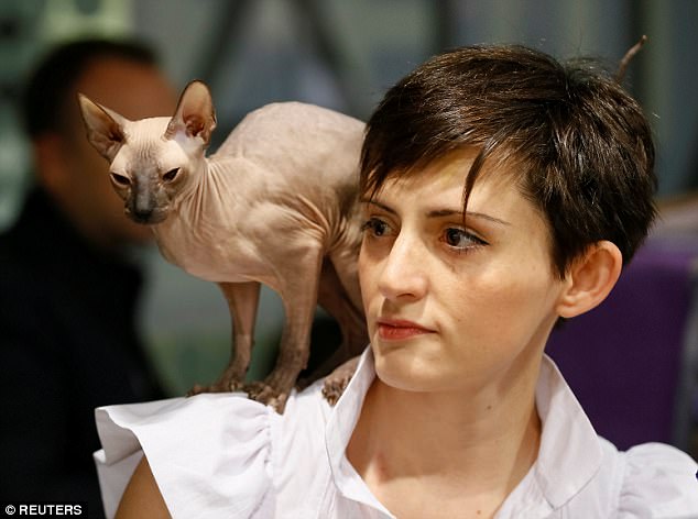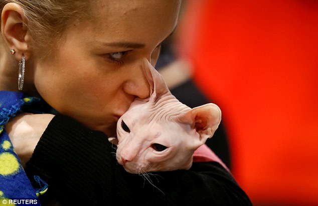 Dù có ngoại hình kì dị nhưng mèo không lông nhận được sự chú ý và quan tâm đặc biệt của người tham gia triển lãm. Nhiều người không ngần ngại ôm ấp hay hôn chú mèo không lông.
