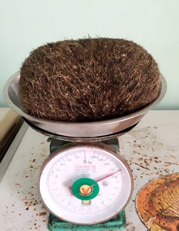 “Trong lúc mổ lợn, tôi bất ngờ phát hiện một vật lạ trong bao tử của con lợn. Thấy lạ, tôi đã bóc bỏ hết lớp mỡ bên ngoài thì lộ ra một "vật lạ" rất đẹp mắt. Vật thể hình bầu dục, dài gần một gang tay, nặng 0,9 kg; bên ngoài bao phủ bởi một lớp lông màu nâu rất dày”, anh Dương thông tin.