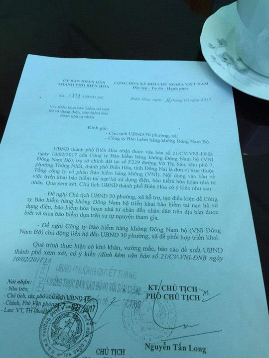 Lãnh đạo của thành phố Biên Hòa ký cả công văn giới thiệu bán bảo hiểm. Liệu đây có phải công văn đúng thẩm quyền của ông phó chủ tịch thành phố. Bảo hiểm sao lại được cả lãnh đạo giới thiệu cho dân mua.