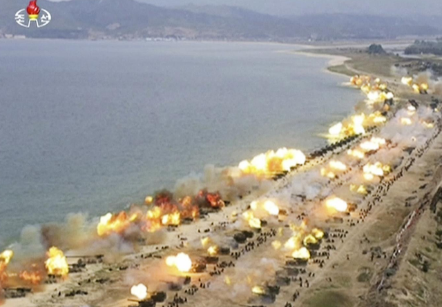 Đích thân nhà lãnh đạo Triều Tiên Kim Jong-un tham gia thị sát cuộc tập trận vào ngày 25/4. Ảnh: Reuters