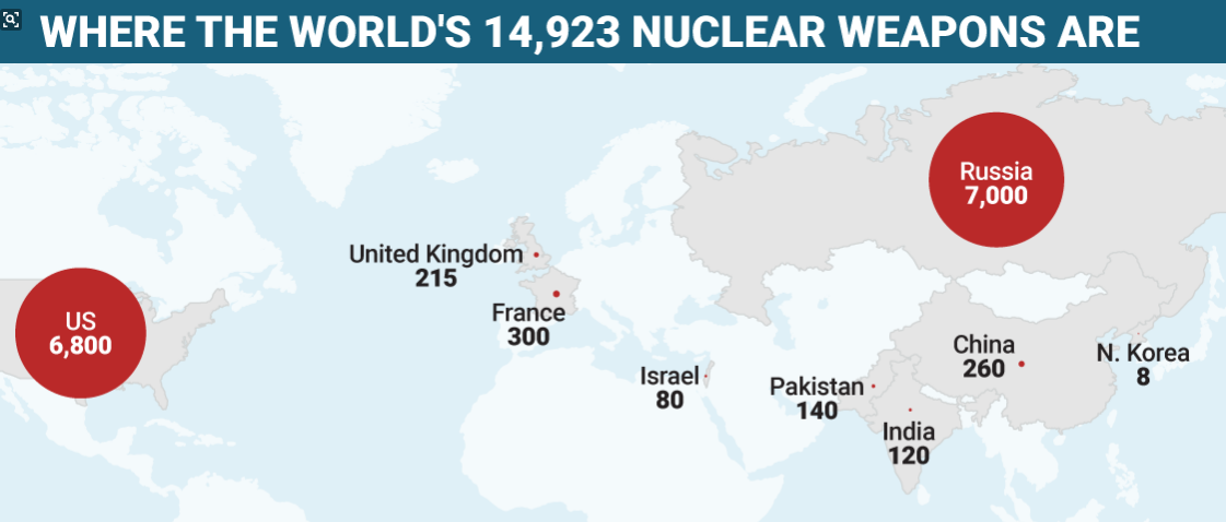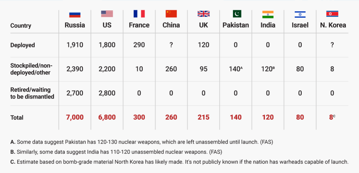 Hiện có 9 quốc gia sở hữu vũ khí hạt nhân là Mỹ (6.800 vũ khí hạt nhân), Nga (7.000), Vương quốc Anh (215), Pháp (300), Israel (80), Pakistan (140), Ấn Độ (120), Trung Quốc (260) và Triều Tiên (8). Nguồn: Business Insider
