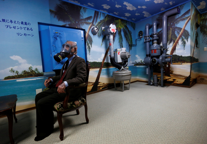 Ông Seiichiro Nishimoto, giám đốc điều hành công ty Shelter, đeo mặt nạ phòng khí độc trong căn phòng mô phỏng hầm trú ẩn hạt nhân được xây dựng dưới tầng hầm ở nhà riêng tại thành phố Osaka, phía tây Nhật Bản.