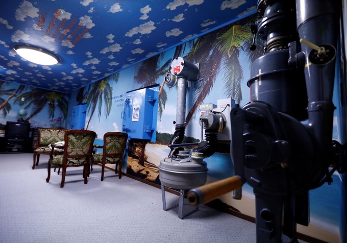 Ngoài máy lọc không khí giúp ngăn chặn phóng xạ, thiết bị đo bức xạ, mặt nạ phòng độc, một lối thoát hiểm, thậm chí cả tivi, cùng với nhiều đồ dự trữ khác dành cho tình huống khẩn cấp.