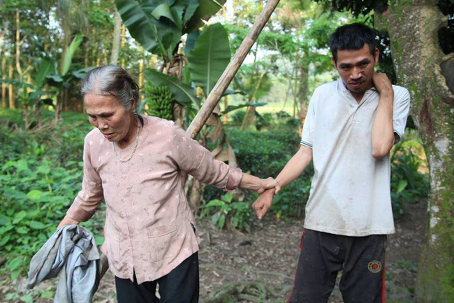 Trong số mấy người con dại, bà Lực bảo chăm con út là anh Toản (35 tuổi) vất vả nhất. Không giống như các anh chị mình, anh Toản có tính hay đi. “Cứ hở ra là nó đi, không biết đường về đâu. Nhiều hôm tôi phải đi tìm cả đêm mới thấy. Nhiều lần tắm cho nó, nó không hài lòng nó đẩy tôi ngã. Sợ con đi không biết đường về, tôi phải lấy dây thừng buộc vào gốc cây hay trước cửa nhà”, bà Lực vừa nói vừa buộc chân con trai lại.
