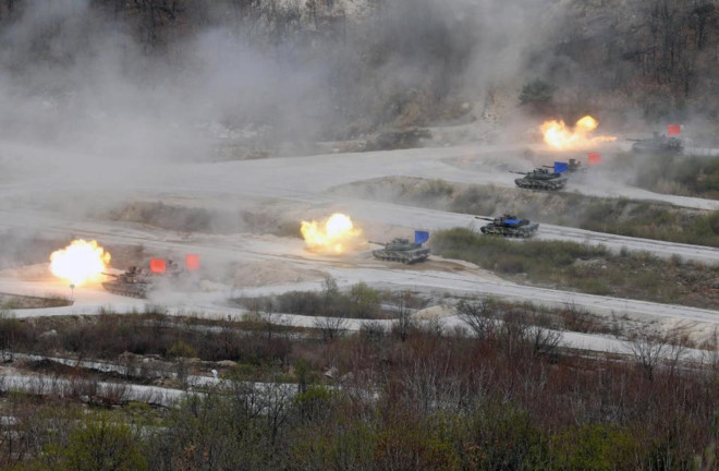 Căng thẳng đang gia tăng liên tục tại bán đảo Triều Tiên. Các cuộc tập trận của Hàn Quốc - Mỹ và Triều Tiên liên tục diễn ra. Trong ảnh, xe tăng Mỹ - Hàn Quốc trong cuộc tập trận ngày 21/4. Ảnh: Reuters.
