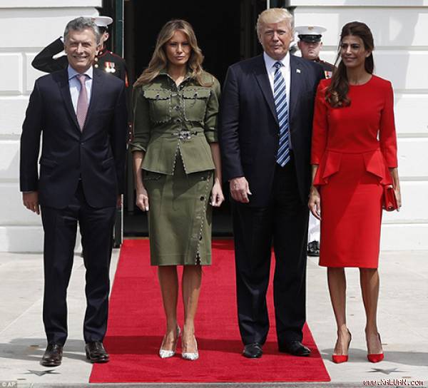 Bà Melania hôm 27/4 cùng Tổng thống Mỹ Donald Trump chào mừng Tổng thống Argentina Mauricio Macri và phu nhân Juliana Awada tại Nhà Trắng, theo Express.