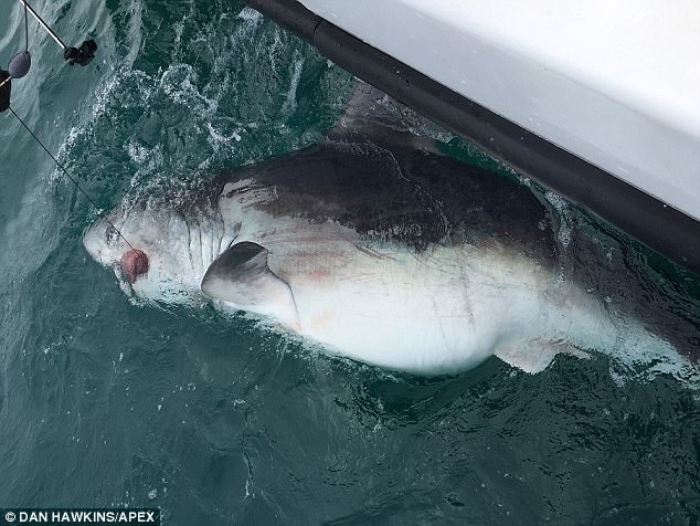 Ngư dân Dan Hawkins ước tính con cá mập dài gần 3 mét, nặng 227kg.