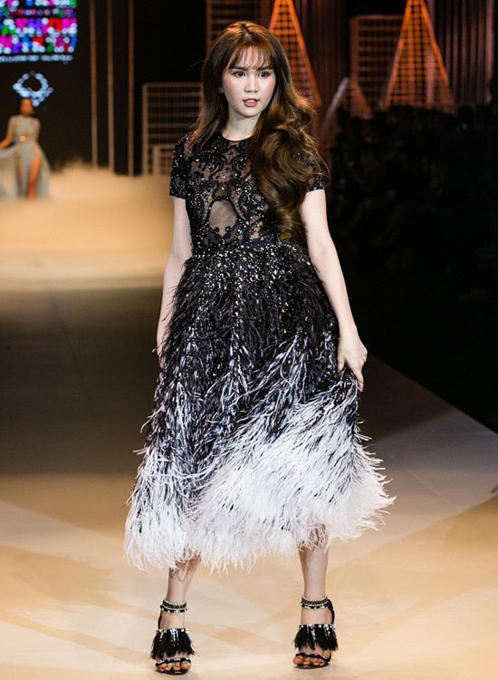 Tuy nhiên, dù là lần đầu đến với Tuần lễ thời trang Việt Nam với vai trò người mẫu, Ngọc Trinh lại nhận được nhiều lời chê hơn là khen. Ngoài chiếc váy trong suốt khoe gần như toàn bộ cơ thể, Ngọc Trinh còn đi catwalk với chiếc váy đen lấp lánh. Diện váy này, cư dân mạng cho rằng trông Ngọc Trinh giống như một cây nấm bởi nó đã “nuốt” chiều cao 1m7 của cô.