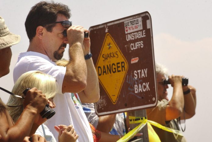 Người dạo biển dùng ống nḥm quan sát khi thấy cá mập xuất hiện gần bờ biển San Onofre năm 2003. (H́nh minh họa: Sandy Huffaker/Getty Images)