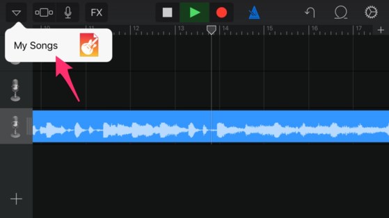 - Bước 5: Tiếp theo, bạn bấm vào biểu tượng mũi tên ở góc trên bên trái và chọn My Songs. Bài hát sẽ được lưu lại dưới dạng một project trong GarageBand.