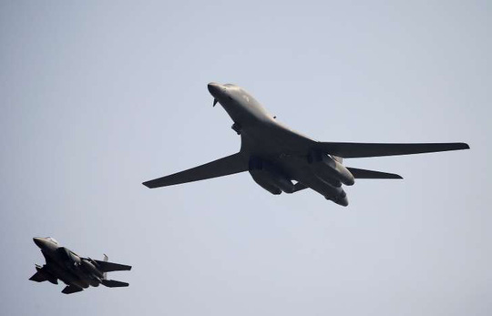 Một chiếc máy bay ném bom B-1B (phải) của Mỹ bay trên khu vực căn cứ không quân Osan ở Pyeongtaek, Hàn Quốc tháng 9-2016. Ảnh: Reuters
