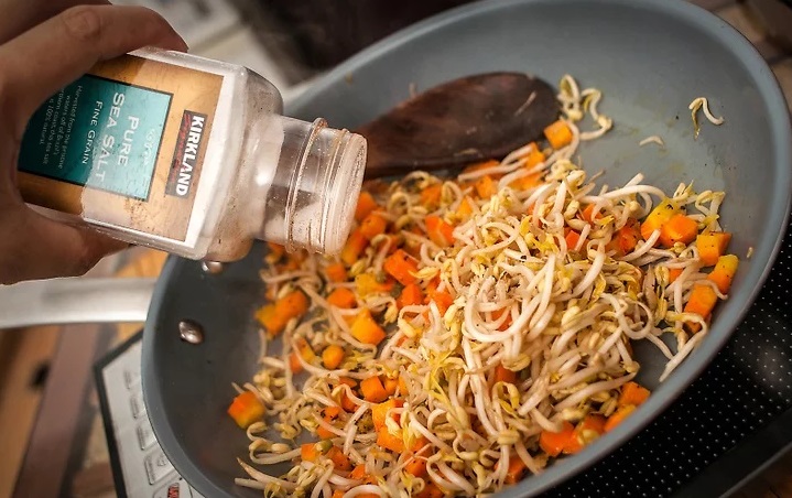 - Cho dầu ăn vào chảo, làm nóng với lửa vừa rồi cho tỏi, gừng, cà rốt, hành tây và giá đỗ vào xào sơ, nêm với muối và hạt tiêu vừa ăn.