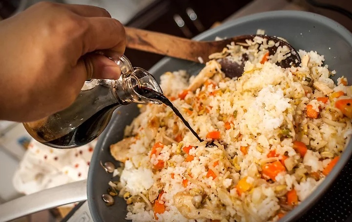 - Cho cơm vào chảo trộn đều với các nguyên liệu khác. Thêm nước tương và tiếp tục rang tới khi cơm nóng lên và trộn đều cùng các nguyên liệu khác.