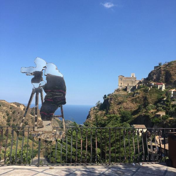 Người dân Sicily ưu ái dành tình cảm cho đạo diễn Francis Ford Coppola bằng một bức tượng kim loại hình ông bên máy quay phim. Phía xa là nhà thờ Santa Maria Degli Angeli, nơi quay cảnh ông trùm Michael Corleone kết hôn với người vợ đầu tiên. Ảnh: James Dunn/Daily Mail.