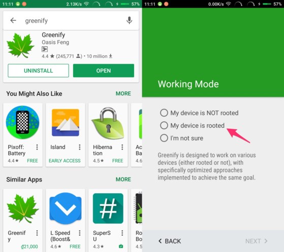 - Bước 1: Đầu tiên, bạn hãy tải và cài đặt ứng dụng Greenify tại địa chỉ https://goo.gl/weo88, lựa chọn chế độ hoạt động tương ứng (đã root, chưa root hoặc không chắc chắn).