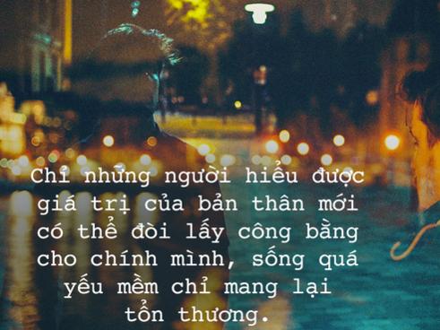 Chỉ những người hiểu được giá trị của bản thân mới có thể đòi lấy công bằng cho chính mình, sống quá yếu mềm chỉ mang lại tổn thương. Đừng hy vọng có thể dựa dẫm vào ai để thụ hưởng hạnh phúc cả đời, hy vọng rồi sẽ chỉ chuốc lấy thất vọng, một vài lần sảy chân có thể đẩy chúng ta tới miệng vực của tuyệt vọng và đau thương.