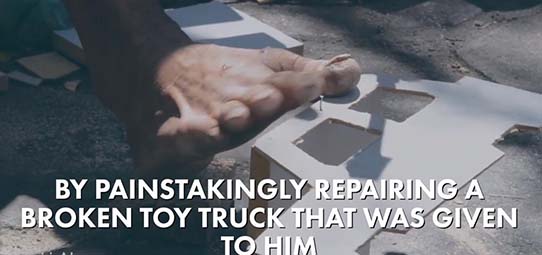 Người đàn ông năm nay 47 tuổi sinh ra đã không có tay, nhưng điều này không làm cho ông nhụt chí, ông đã học cách dùng đôi chân để sinh hoạt và làm ô tô đồ chơi để kiếm sống.
