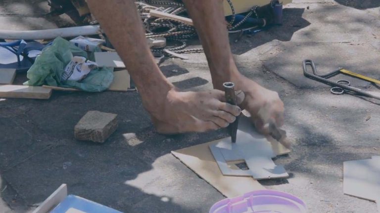 Với bàn chân kẹp chặt dụng cụ đục lỗ lên miếng gỗ.