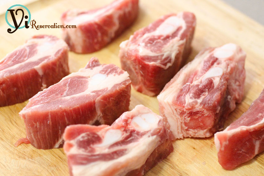 - Ngâm xương sườn trong nước lạnh ít nhất nửa giờ để sạch máu. Rửa thật sạch sườn, để ráo nước. Cắt thành từng miếng vừa ăn.
