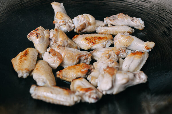 - Cho gừng và thịt gà vào chảo, cho to lửa và chiên sơ để thịt gà vàng đều cả 2 mặt.