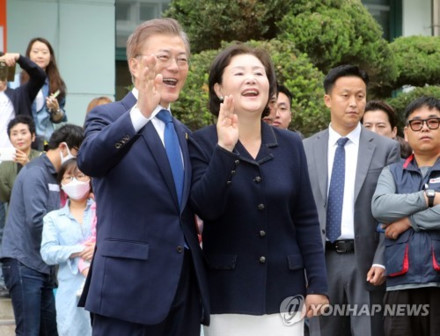 Ứng viên tranh cử Tổng thống Hàn Quốc Moon Jae In và vợ tại một điểm Bầu cử ở Seoul ngày 9.5. Ảnh: Yonhap