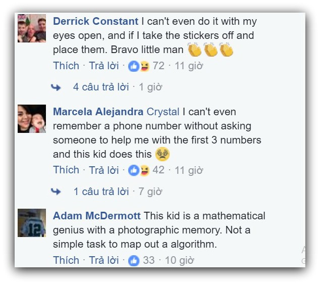 Phần lớn dân mạng không khỏi ngạc nhiên và thán phục khi cậu bé chỉ mất 1,1 phút nhẩm tính các bước xoay trong đầu, sau đó mất 43 giây để khối lập phương có 6 mặt đồng màu. Đặc biệt, cậu làm điều đó khi không có sự hỗ trợ của đôi mắt.