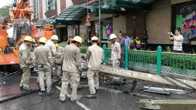 Các nhân viên của cơ quan điện lức Bang kok đang nhanh chóng thu dọn những chiếc cột điện bị đổ để không làm ảnh hưởng đến giao thông trên đường.