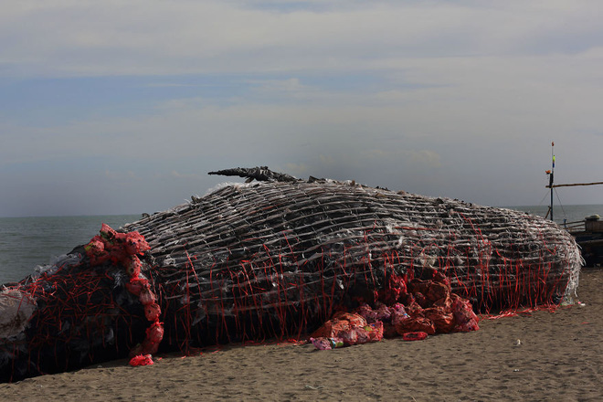 Có chiều dài 22m và rộng 3m, con cá voi khổng lồ được các nghệ sĩ địa phương và các nhà hoạt động bảo vệ môi trường làm hoàn toàn từ nhựa và rác thải thu lượm được trên biển, nhằm tạo ra hiệu ứng chân thật cho từng chi tiết cũng như gây ấn tượng mạnh với người xem.
