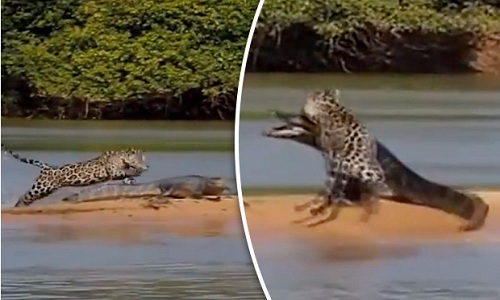 Cuộc chiến 'đẫm máu' giữa cá sấu và báo đốm đã được ghi lại một cách sắc nét. Báo đốm chủ động tấn công cá sấu khi cá sấu đang phơi mình trên bờ. Clip được ghi lại bởi National Geographic tại rừng già Brazil.