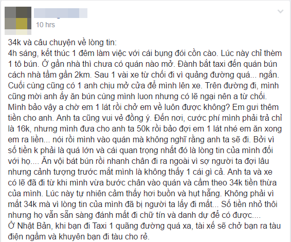 Đó là câu chuyện được facebooker H.Q chia sẻ trên mạng xã hội về việc anh bị mất 34.000 đồng tiền thừa taxi. Dù số tiền không nhiều nhưng nó khiến anh rất buồn vì đã trót tin tài xế nhưng người đó lại không giữ chữ tín.