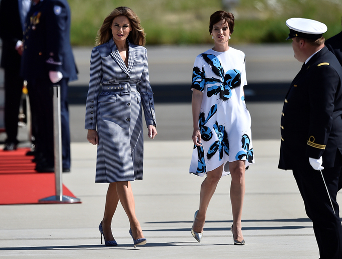 Bà Melania chọn thiết kế sang trọng trong bộ sưu tập của Michael Kors xuất hiện tại sân bay Brussels ngày 24/5 cạnh phu nhân Thủ tướng Bỉ.