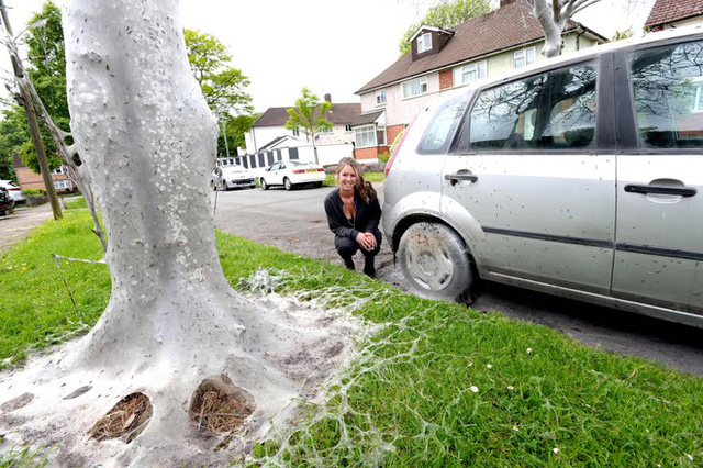 Cô Kirsty Roberts, 27 tuổi, thức dậy và sốc khi nhìn thấy chiếc xe ô tô của mình bị phủ đầy mạng trắng cùng hàng trăm con sâu bướm bò lổm ngổm, cái cây bên cạnh trợ trụi lá cũng trở nên trắng xóa.Dù thời tiết ở đây đang ẩm ướt nhưng cũng không thể ngăn cản lũ sâu bướm hoành hành. Những con sâu bướm sẽ phát triển thành bướm Ermine và người dân địa phương lo ngại rằng chúng sẽ bay tứ tung trên đường phố, gây ảnh hưởng đến cuộc sống.