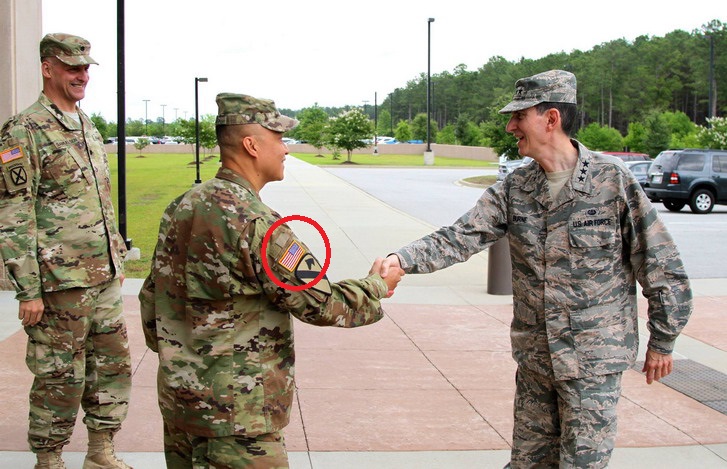 Theo điều luật quân đội số 670-1: ‘Quốc kỳ Mỹ được gắn trên vai trái hoặc vai phải; vùng ngôi sao hướng về phía trước, để ở mép bên phải của lá cờ. Vì khi để như thế này, lá cờ sẽ hướng về bên phải của người nhìn, tạo ra cảm giác lá cờ đang bay trong gió khi người đeo di chuyển về trước’.