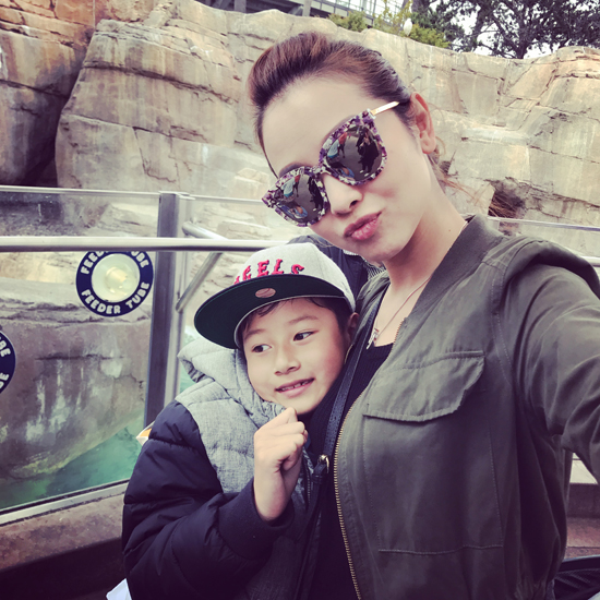 Jennifer Phạm và con trai cùng đi giày đôi khi đến vui chơi ở công viên Seaworld.