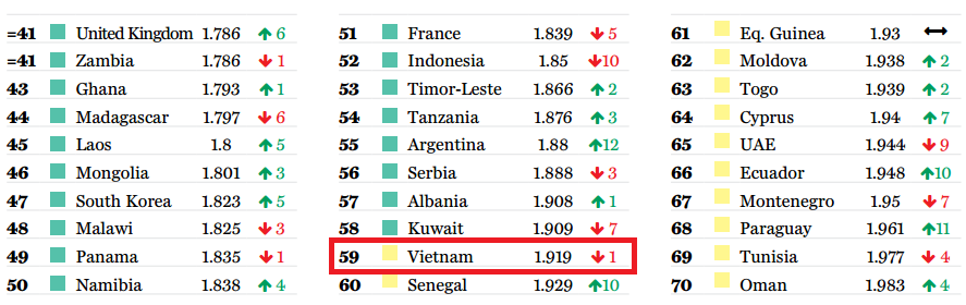 Việt Nam giảm 1 bậc so với năm trước xuống vị trí thứ 59 trong chỉ số GPI, nằm trong nhóm các nước trung bình.