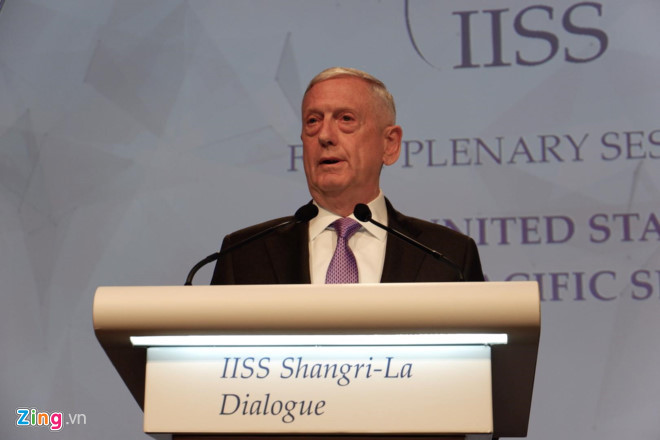 Bộ trưởng Quốc phòng Mỹ James Mattis có bài phát biểu tại Diễn đàn về an ninh châu Á - Thái Bình Dương lần thứ 16 vào sáng 3/6 ở Singapore.