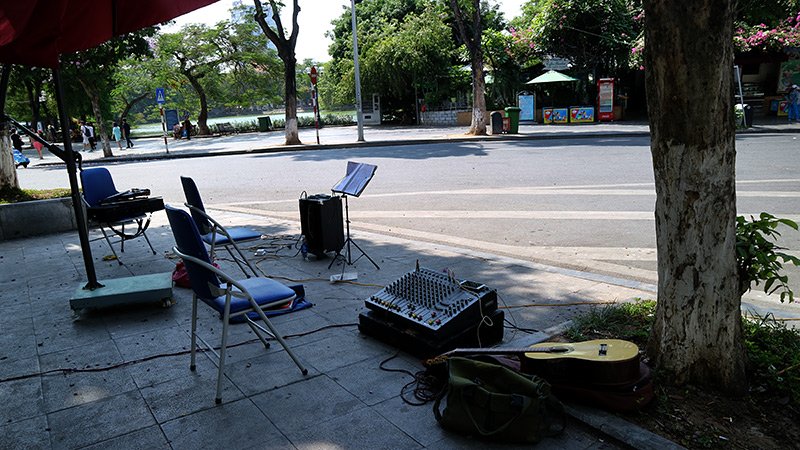 Sân khấu ca nhạc ngoài trời vào mỗi cuối tuần đông đúc khán giả hôm nay chỉ chỏng chơ những nhạc cụ với dàn loa thùng phát luôn phát những bản nhạc mới gọi du khách.