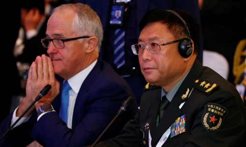 Trung tướng Hà Lôi (phải) ngồi cạnh Thủ tướng Australia Malcolm Turnbull tại Đối thoại Shangri-la. Ảnh: Reuters