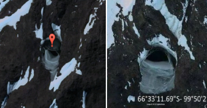 Scott dường như muốn chỉ ra mối liên hệ tiềm năng giữa hai lối vào và chiếc UFO bị rơi bị chôn vùi một phần dưới lớp băng Nam Cực. Đáng tiếc, hiện bức ảnh chụp hang động thứ hai trên Google Earth đã bị làm mờ. Hang động này (ảnh trên) có lối vào với cấu trúc hình vòm cung trông khá cân đối, một dấu hiệu cho thấy đây có thể là một công trình nhân tạo.