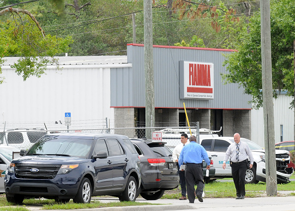 Cảnh sát đang làm việc bên ngoài cơ sở Fiamma chuyên bán dụng cụ cho xe RV tại đông bắc Orlando, nơi xảy ra một vụ bắn có tới sáu người thiệt mạng vào ngày thứ Hai. (Gerardo Mora/ Getty Images)