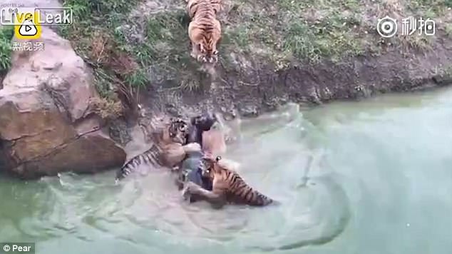 Ngay khi rơi xuống nước, con lừa tội nghiệp bị tấn công ngay lập tức bởi 2 con hổ đang háu đói. Cảnh tượng man rợ đó diễn ra ngay trước mặt khách tham quan; 2 con mãnh thú thi nhau tấn công con mồi, ngoạm cổ, thực hiện những cú cắn chí mạng. Dù có cố gắng bơi thoát thân nhưng con lừa cũng không tránh khỏi cái chết thảm thương và bị 2 con hổ kéo lê vào bờ.